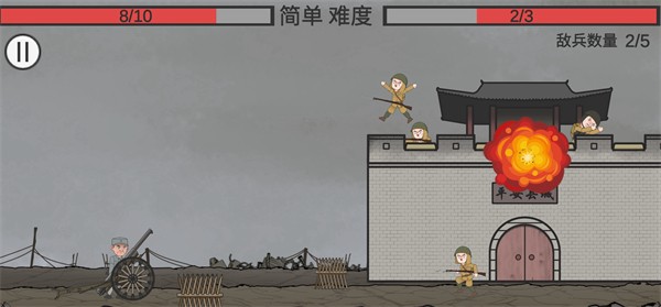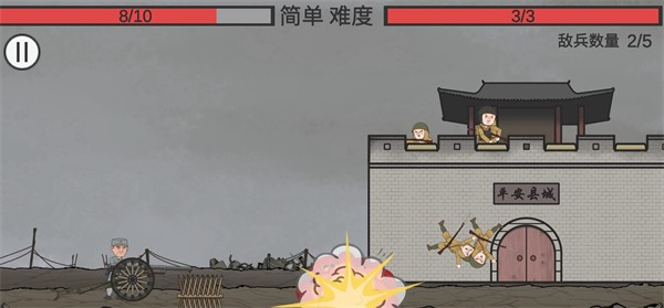 2、操控我方火炮,瞄准平安县城上的敌兵,发射炮弹将其击杀,需精准打击以减少自身损耗。