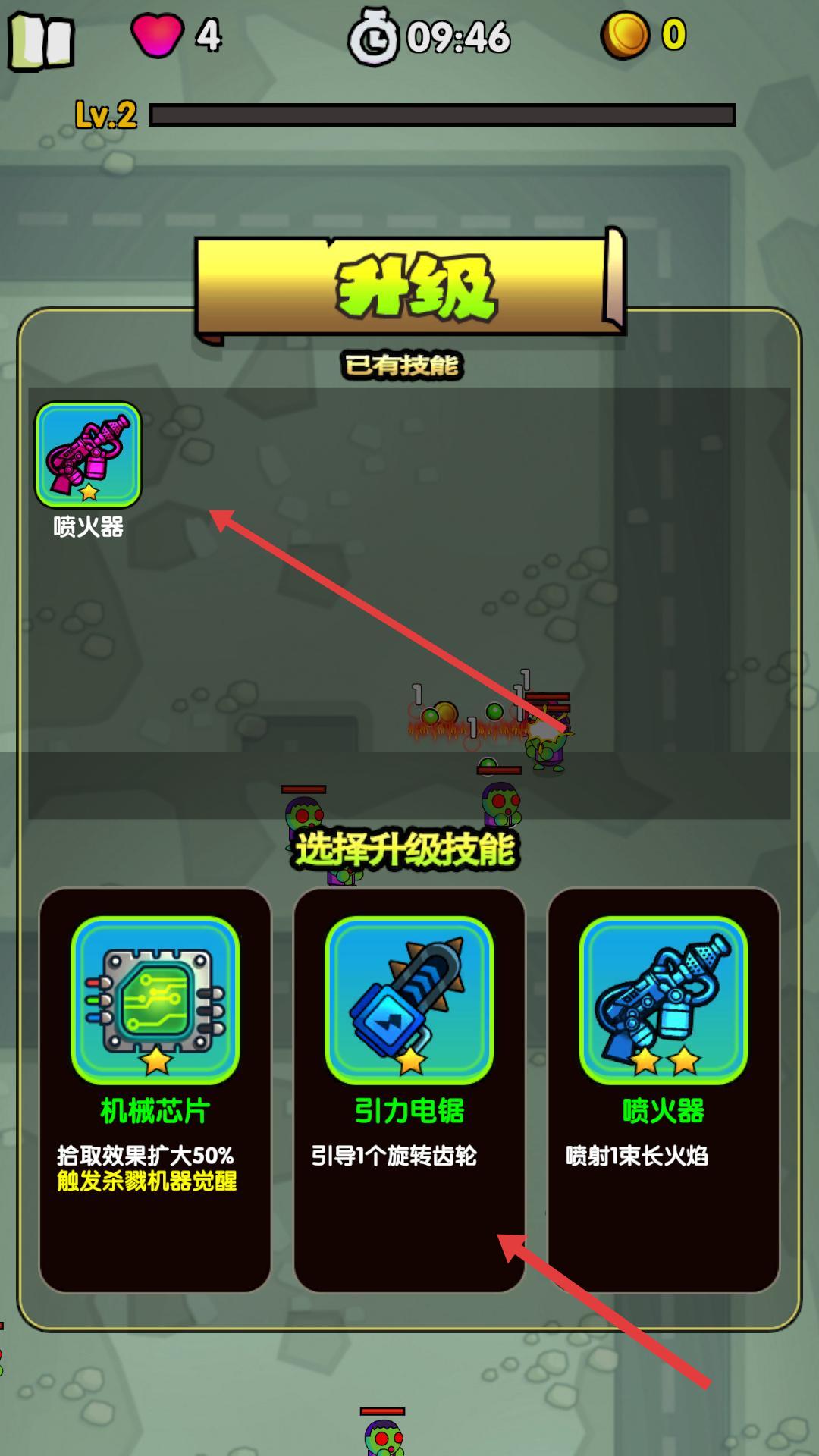 3、当角色达到升级条件时,会弹出技能升级界面,可从强化等技能里选一个提升,增强角色战斗能力。