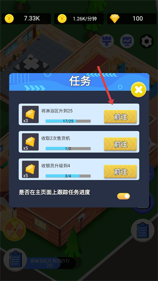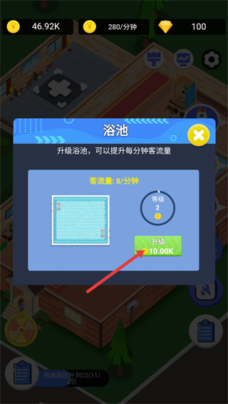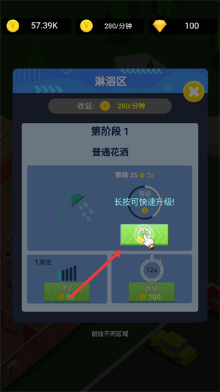 1、在淋浴区点击升级按钮,提升淋浴设施等级,以此增加每分钟的收益,为后续发展积累资金。